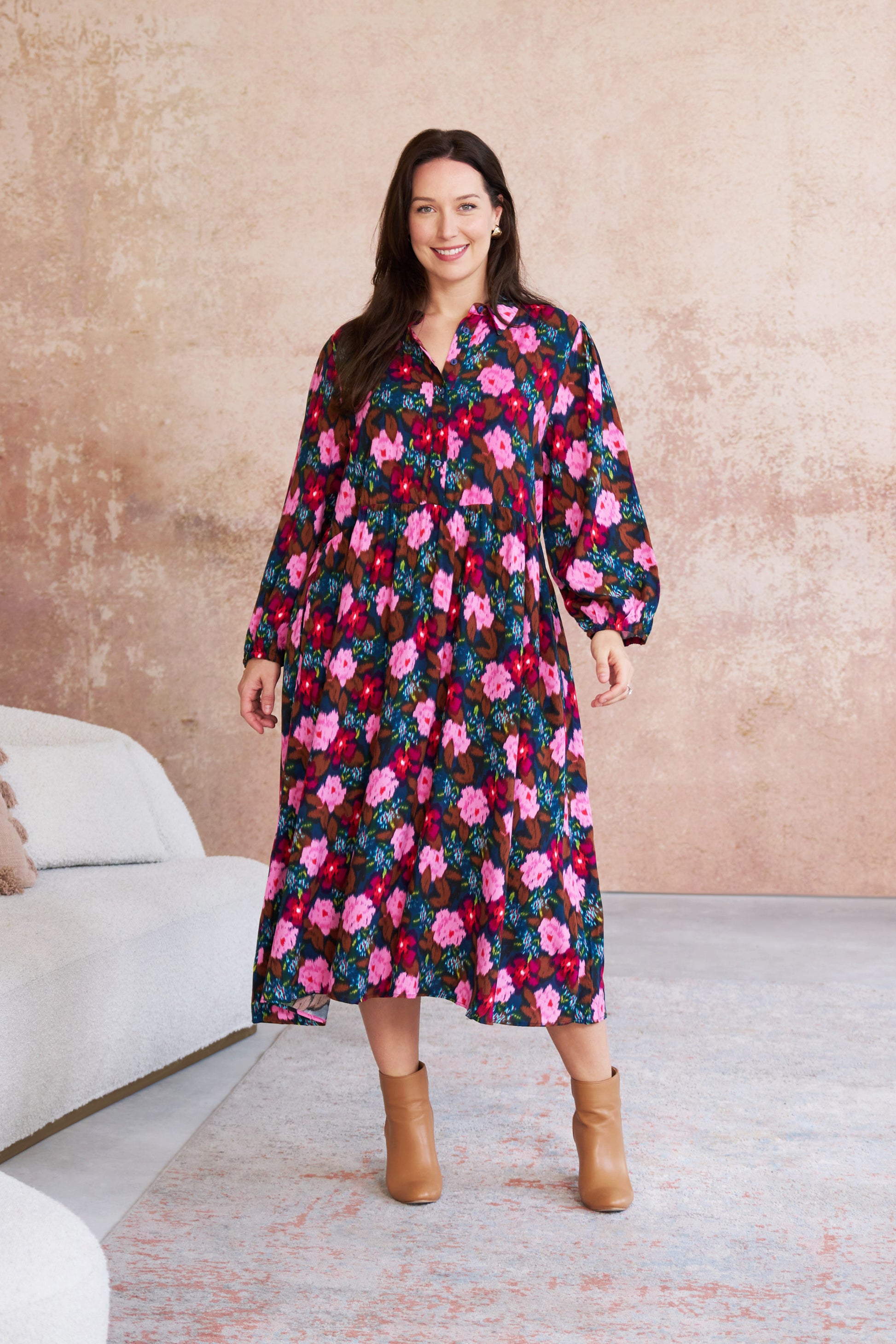 Step into sophisticated style with the Dexter Dress in our exclusive Hazy Floral Print. This midi-length masterpiece combines timeless design with modern comfort, making it your go-to piece for any occasion.